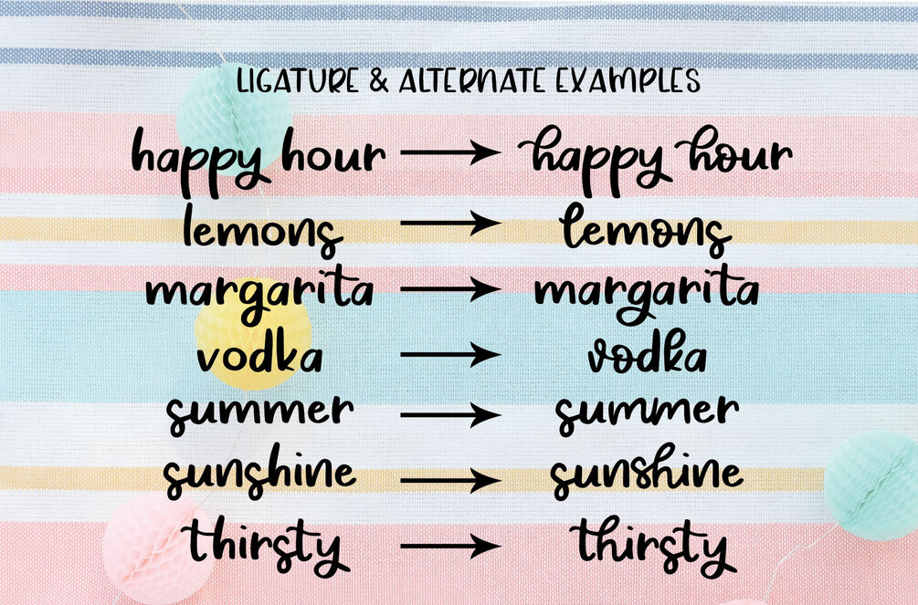 Happy Hour has a variety of unique, coded features to create compelling, handmade outcomes including 9 alternate characters and 8 ligatures. You will need to install the OTF version of the font to have access to all the alternate characters and ligatures.
